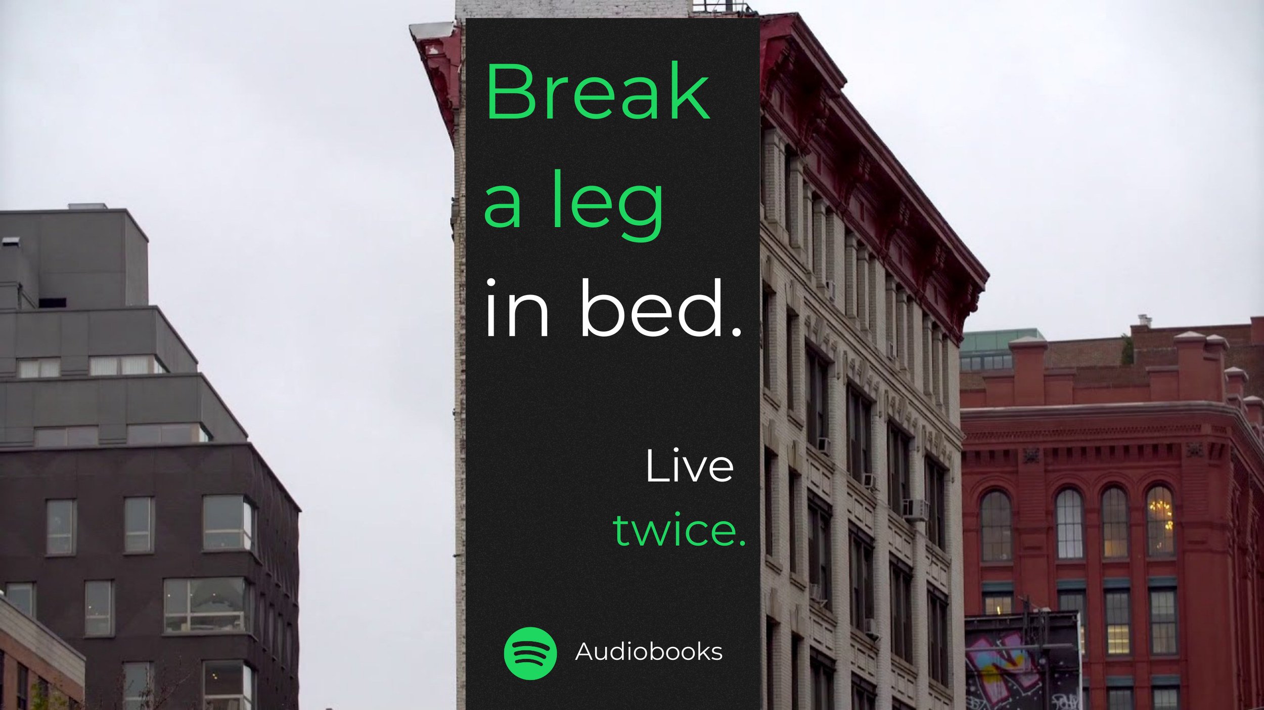 Who doesn’t wish they could be in two places at once? You may be out running errands, dreading every minute of responsibly maintaining your life. But, really, you’d rather be saying hello to the love of your life or joining a glamorous circle of hedonistic aristocrats who throw mansion parties every night. You know, living life like it should be. Unfortunately, you can’t physically be in two places at once. But with Spotify Audiobooks, you can let your body take out the trash while your mind slays dragons and saves dames. You only live once? Psh. Live twice.